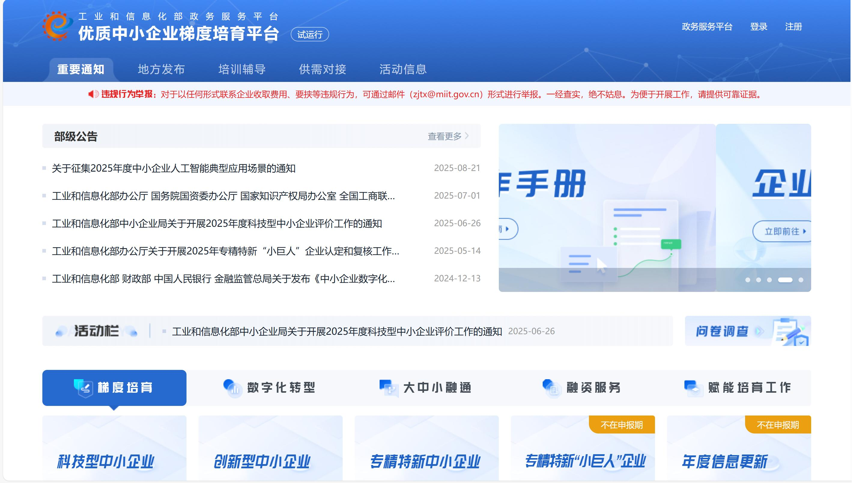 1、进入优质中小企业梯度培育平台(https://zjtx.miit.gov.cn/)(如下图示)