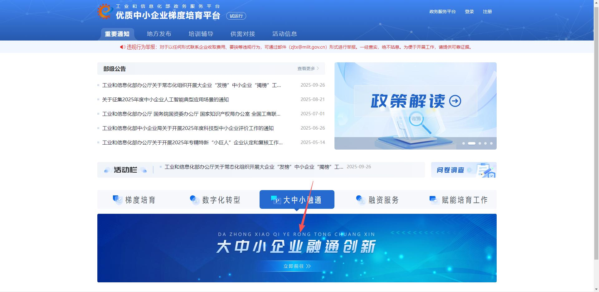 4、登录后,点击“大中小企业融通创新平台”模块(如下图示),跳转至大中小企业融通创新平台首页。