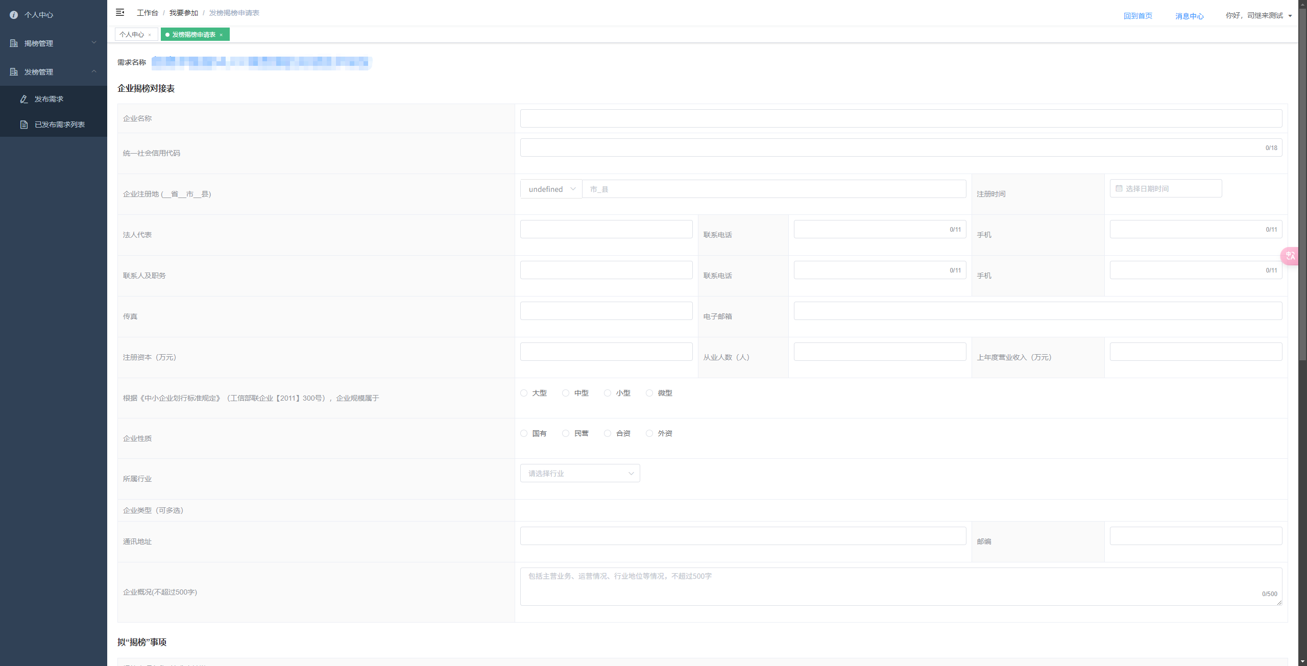 3、若没有平台账号,则需注册账号。账号审核需5个工作日,无账号也可查看大企业需求清单等信息。点击右上角“注册”选项,填写用户注册信息。(如下图示)
