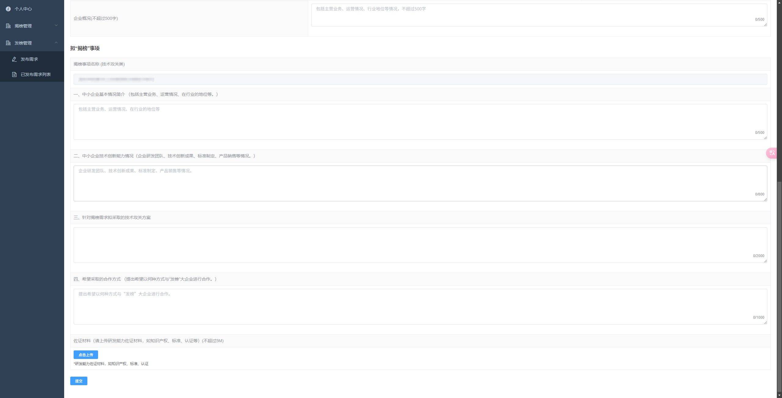 2、填写“揭榜”完整信息,所有选项都要填写完整,上传佐证材料,点击提交,“揭榜”信息就可提交审核。(如下图示)